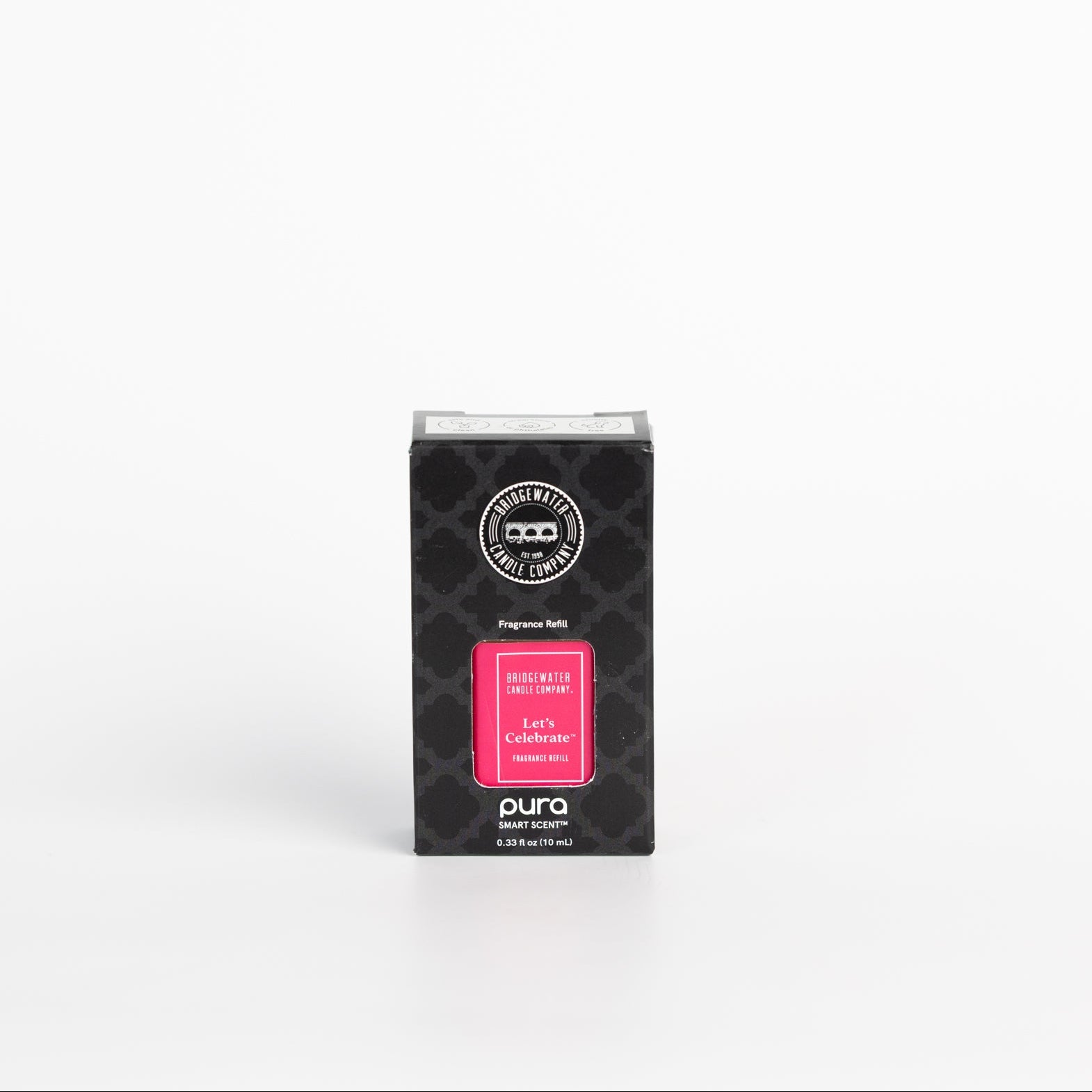 A black rectangular box of Bridgewater Candle Pura + Bridgewater Fragrance Refill in the scent "Let's Celebrate" stands upright on a white background. The front label is pink with white text—ideal for elevating your home fragrance. Open image lightbox